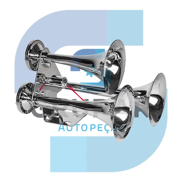 BUZINA CROMADA 3 CORNETAS COM VÁLVULA SOLENOIDE 12/24V Avaliação: SKU.: 3365 Marca: KAUAI Comprar Detalhes do Produto REF: K10052 / DP10096